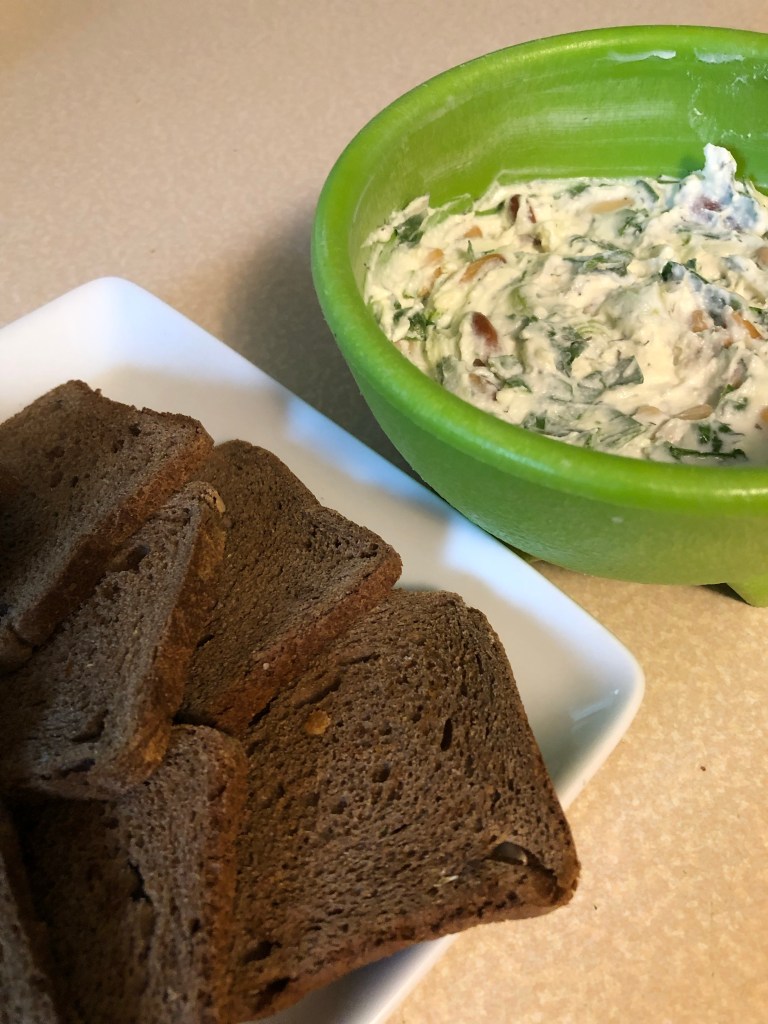 To serve, use toast points (I love pumpernickel toast squares), pita bread sliced into squares, or crackers.