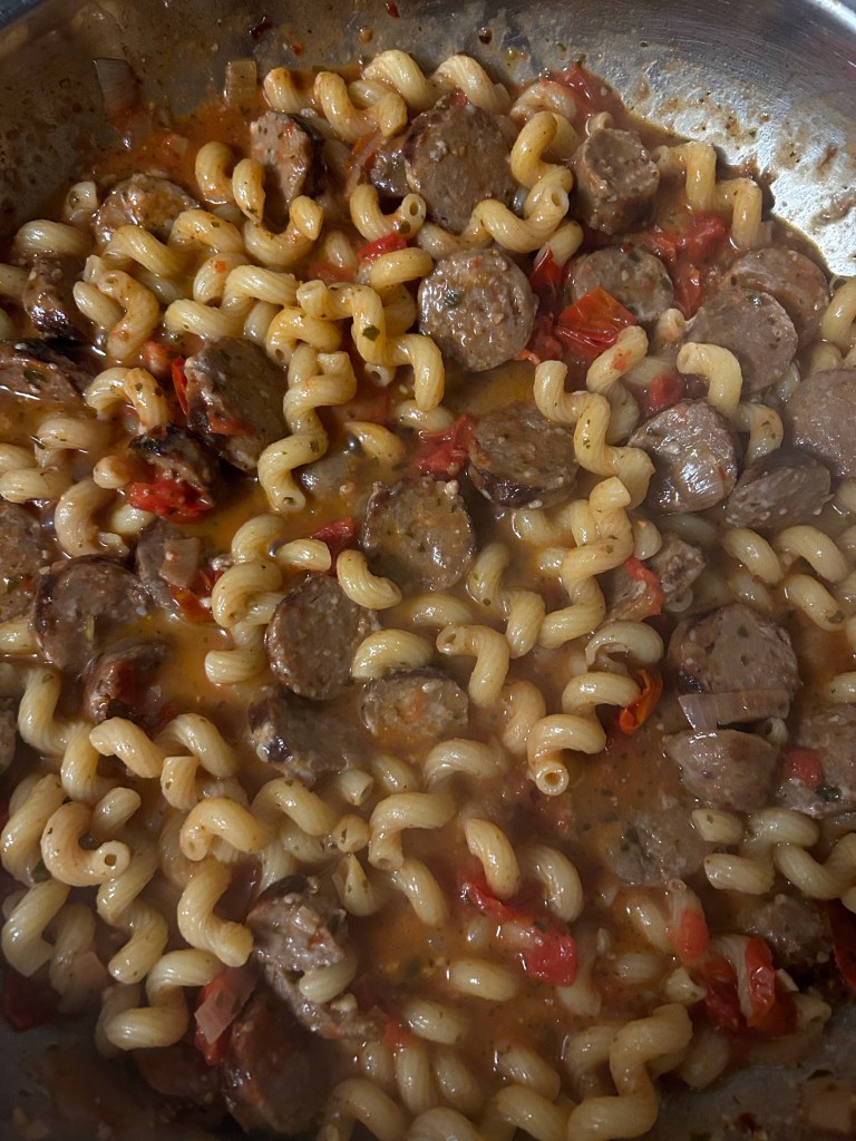 Well, I’m happy to have returned to the kitchen (and even happier my kitchen is still in one piece — but I digress!). I’m not quite back to full-on grocery shopping yet, so one of my priorities this week was to use up an abundance of Italian sausage and grape tomatoes that had followed me home from the store.