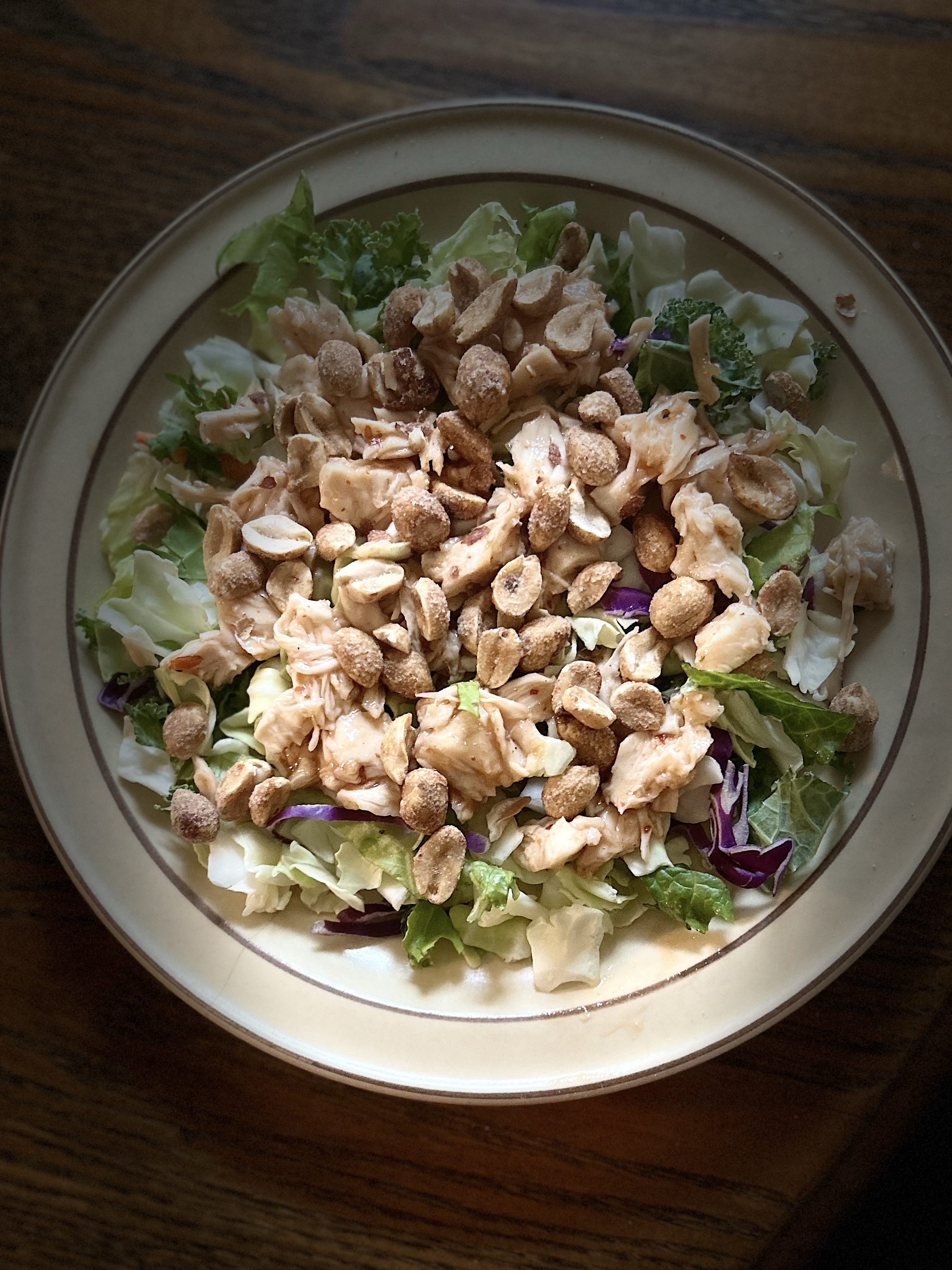 I’ve also been on a quest to up my lunch game with something healthy and satisfying. I love lettuce wraps, but they aren’t exactly the easiest to eat at work, so I decided to deconstruct them. I took a mix of lettuce, green cabbage, kale, shredded cabbage, red cabbage and green onions as a base. Keeping with our theme of using ingredients we have on hand, I tossed some leftover diced, cooked chicken with a healthy amount sweet & spicy Thai chili sauce (so I wouldn’t need extra dressing). Then I topped the whole thing with some honey roasted peanuts. All the flavors of a lettuce wrap with no mess!