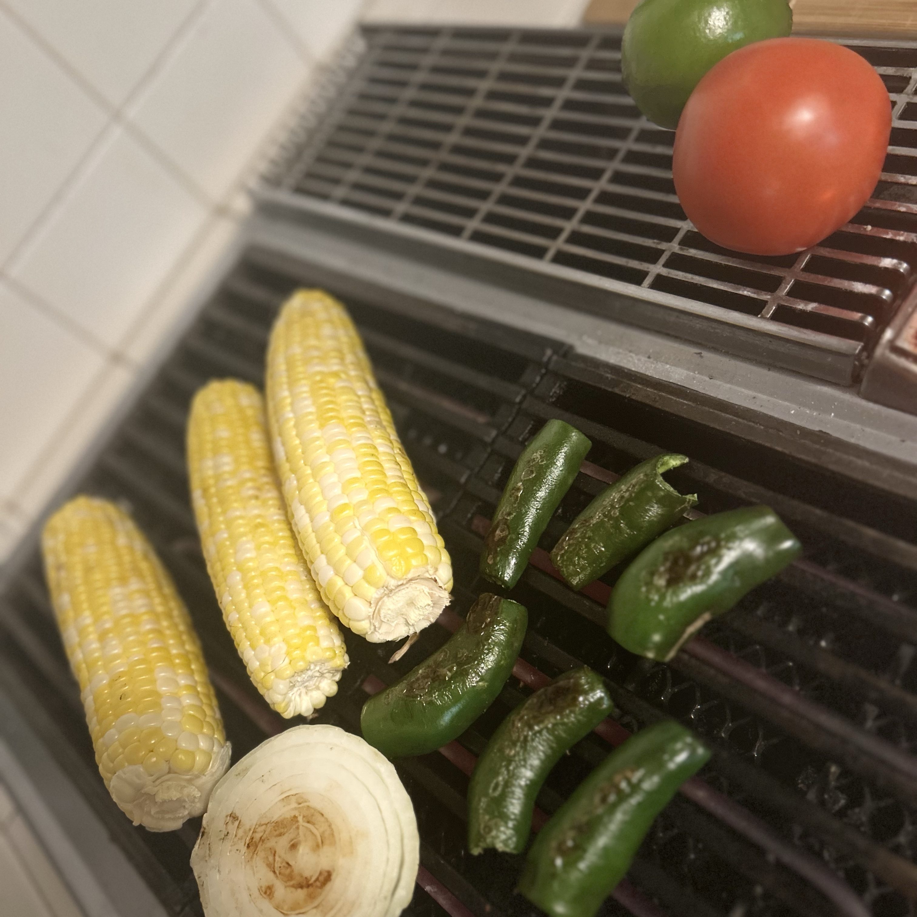 Once the veggies had cooled, I peeled the jalapeños and chopped them finely. The onion got diced, the corn came off the cob, and I added one chopped tomato for a little brightness.