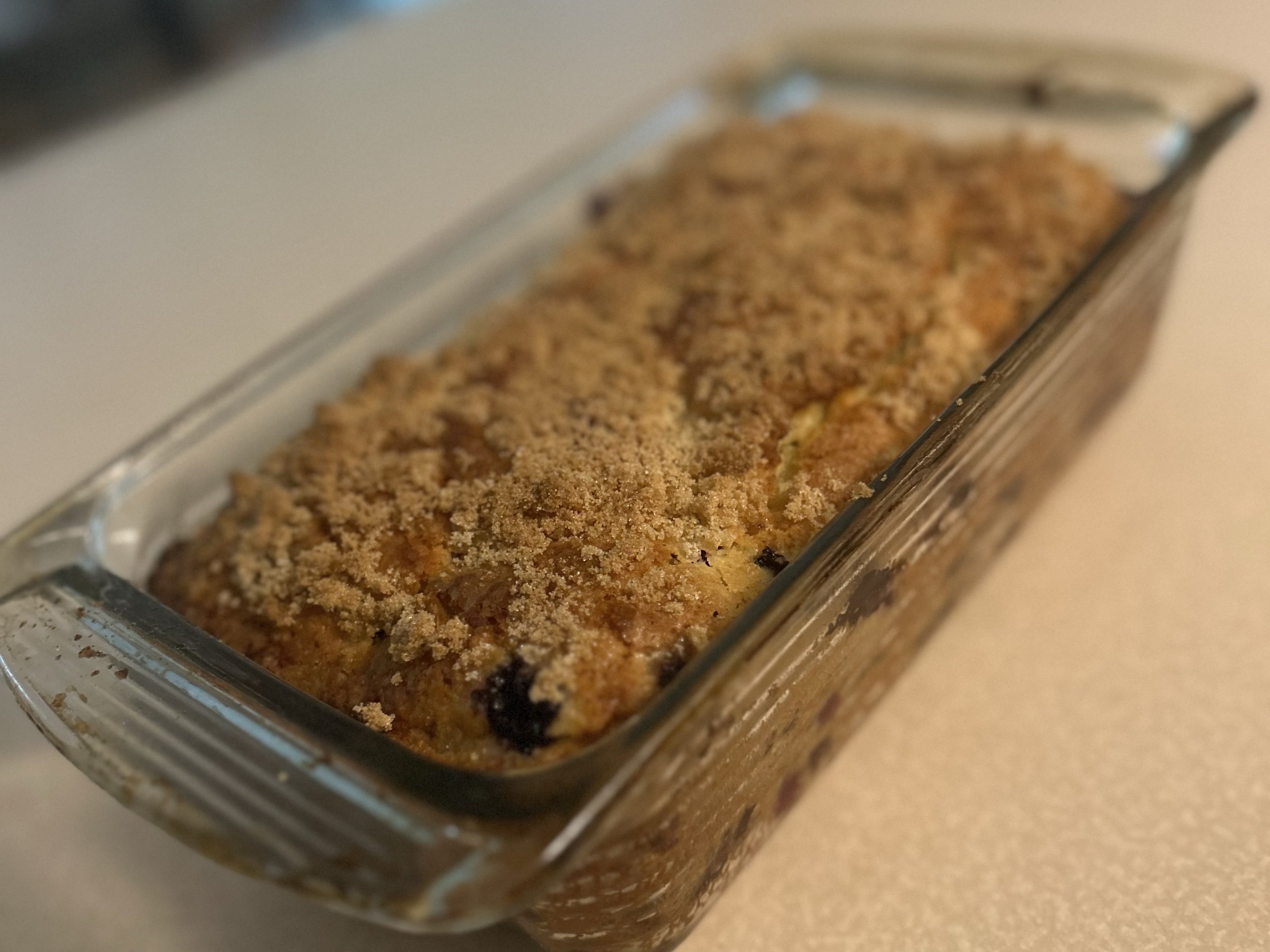Add the oil, vanilla, eggs and lemon juice to the sugar mix. Stir well to combine. Mix the yogurt into the bowl. Add the baking powder and salt to the bowl, stirring well. Add the flour and mix gently to get it all incorporated into the wet ingredients. Finally gently fold the blueberries into the batter. Pour into the prepared loaf pan. In a small bowl, work the granulated and brown sugars together with your hands till it becomes a golden mix. Sprinkle over the top of the loaf.