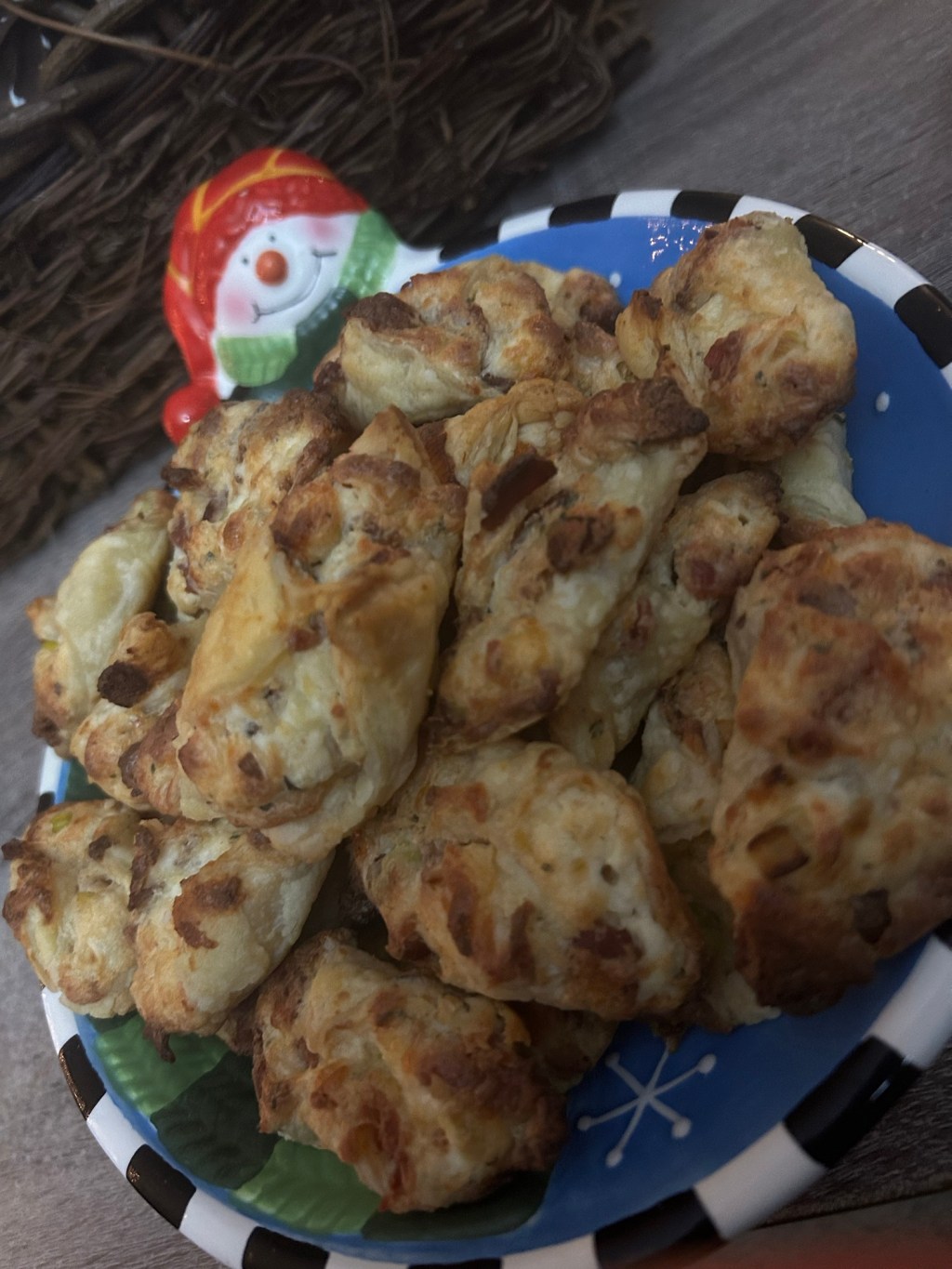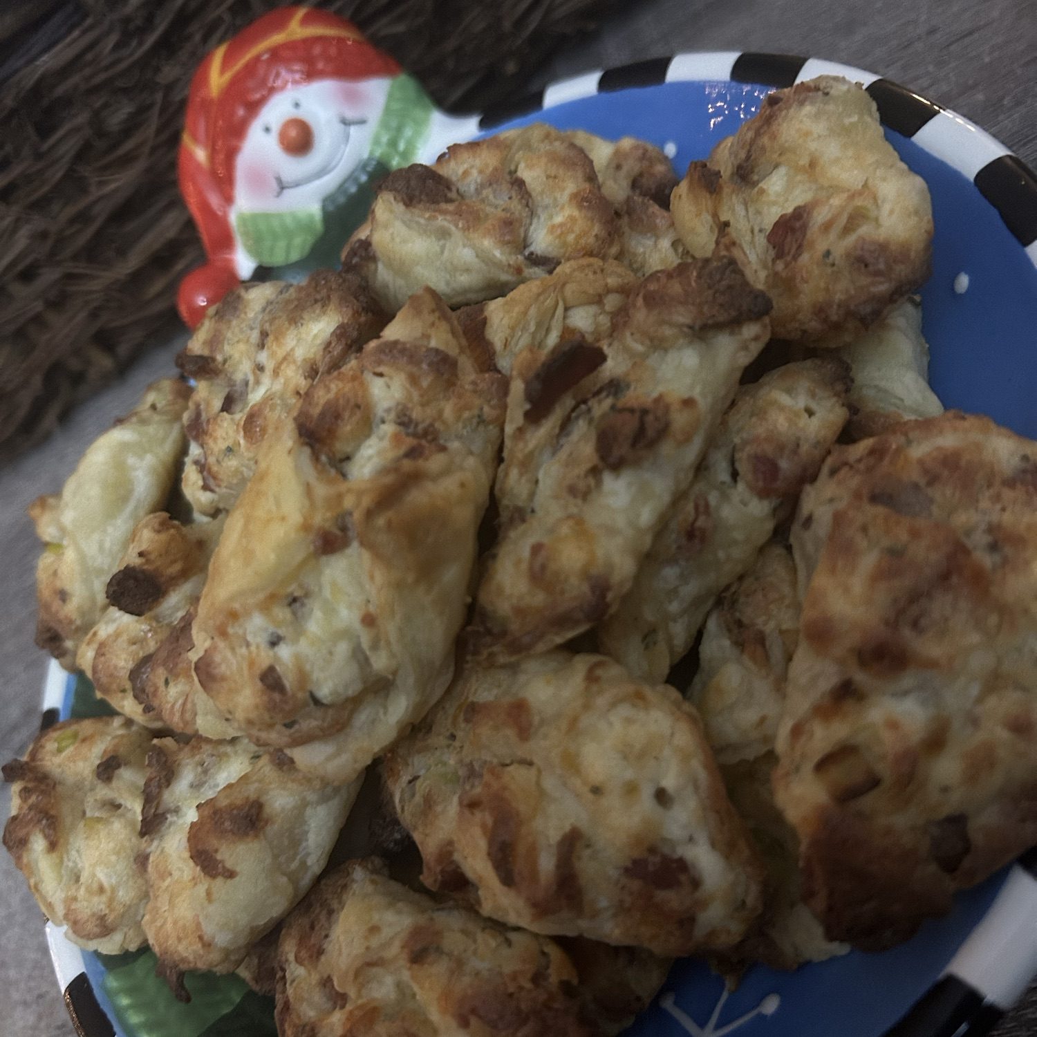 Roll the puff pastry dough out into a square (it will make it easier to cut before baking). In a mixing bowl, cream together the cheeses & parsley then stir in the green onions and bacon. Spread the filling evenly across the puff pastry, going all the way to the edges. With a serrated knife, cut the pastry into 2 inch squares. Bring two corners up to meet in the middle and pinch slightly to seal. Place on a parchment lined baking sheet and bake at 375 degrees for about 12-15 minutes or until they’re golden brown. Serve warm and enjoy (if you have leftovers, just reheat for a few minutes in the air fryer to heat the filling up again)