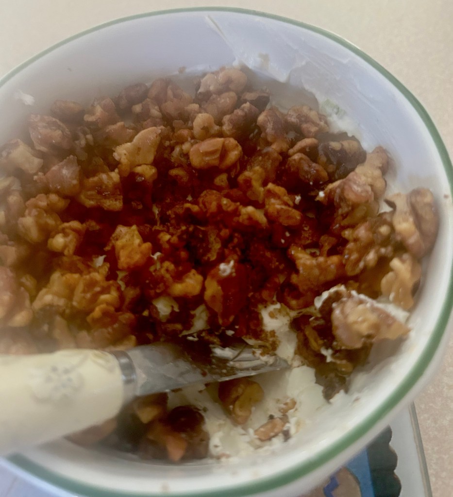 To make the spicy nut mixture, heat 2 tbsp olive oil and 1 tbsp of chili oil in a pan. Add a cup of chopped walnuts and sauté until they’re golden brown. Add 2 tsp of sugar and stir until the sugar is melted into the nuts. Toss with a spice mix of equal parts (I used about a 1/4 tsp of each, but it wasn’t precise) cumin, nutmeg, cinnamon and ground black pepper. Let the mixture cool completely before refrigerating.
