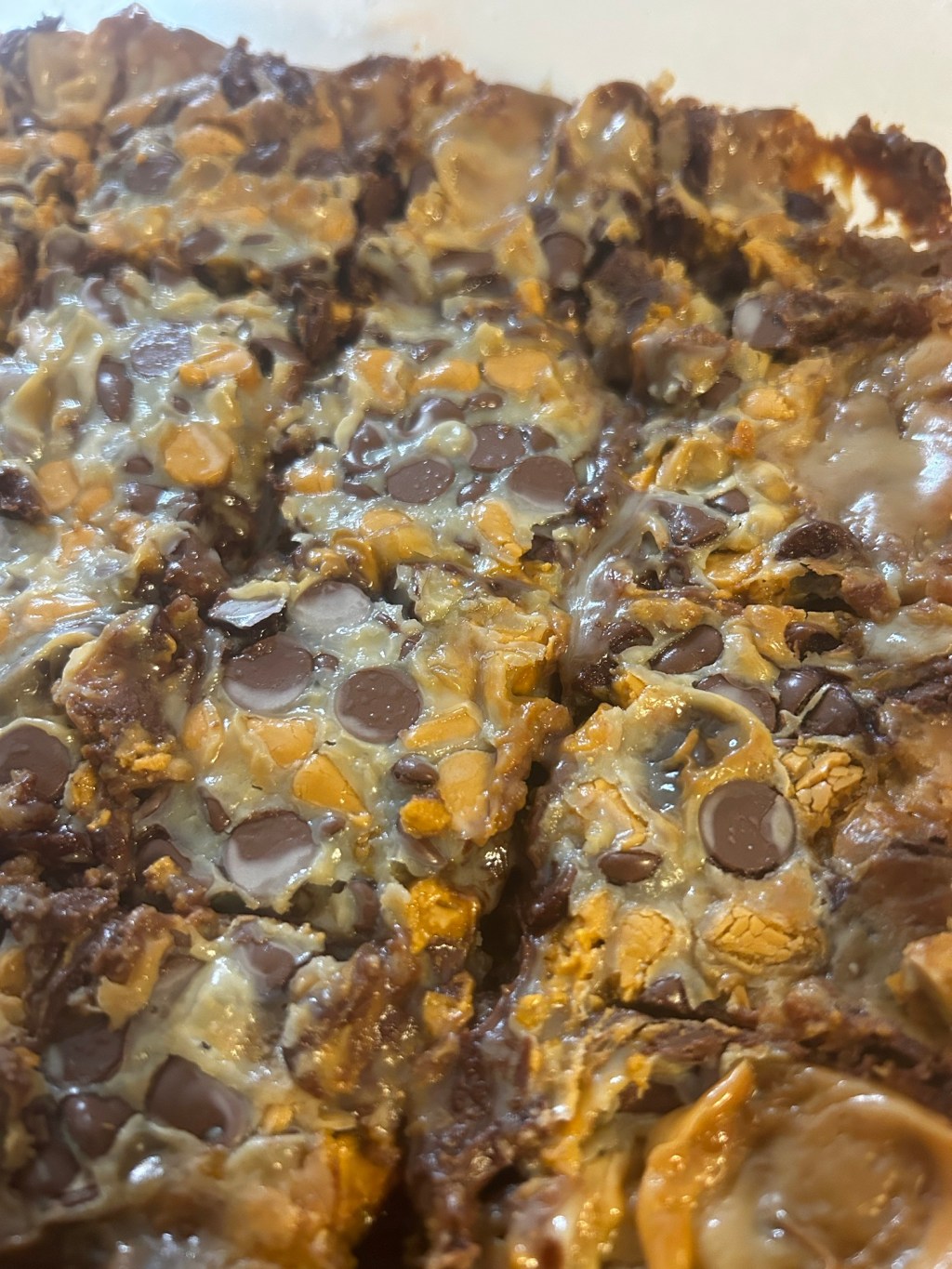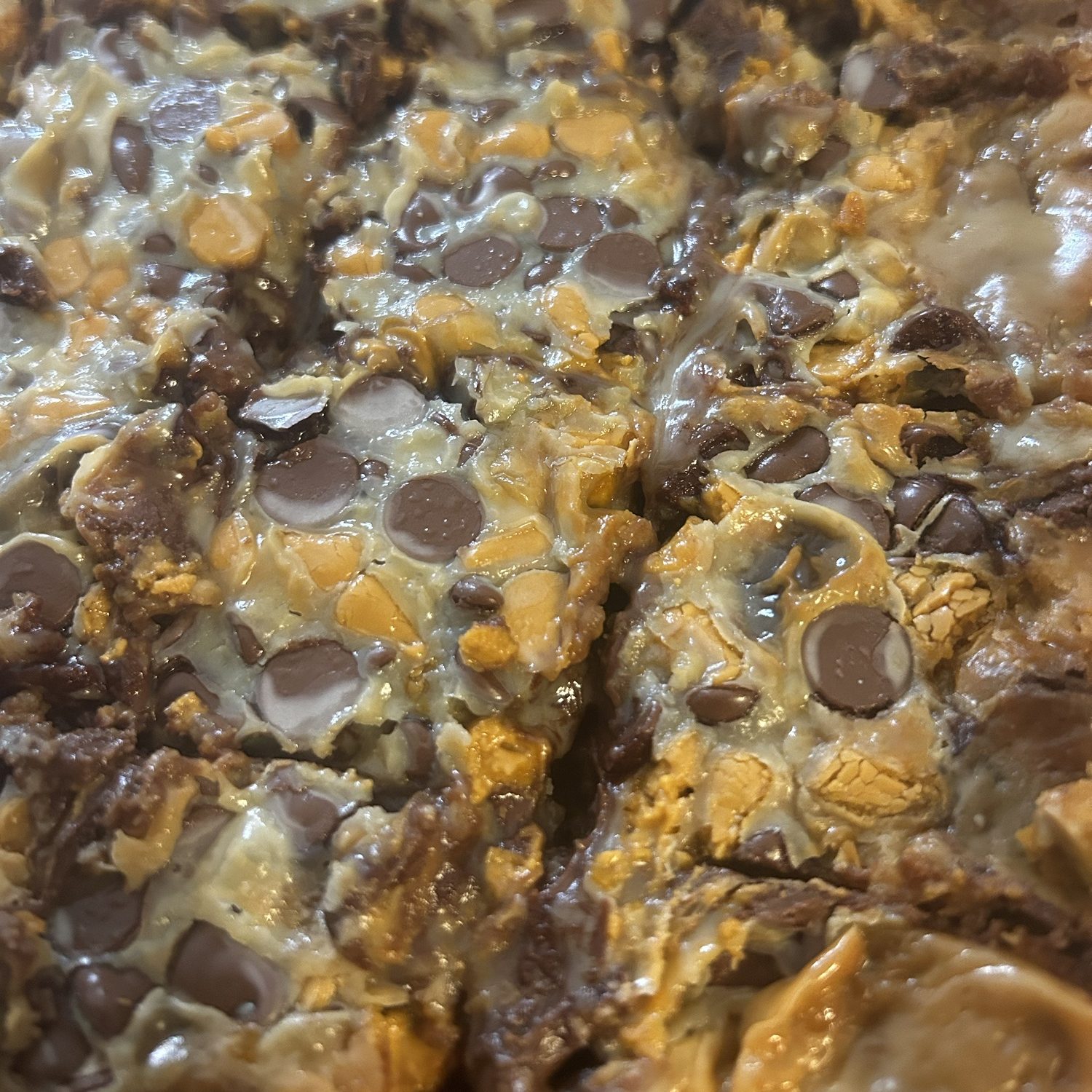 - Layer the ingredients: Pour the sweetened condensed milk evenly over the crust. Sprinkle with chocolate chips and butterscotch chips, pressing them gently into the mixture.