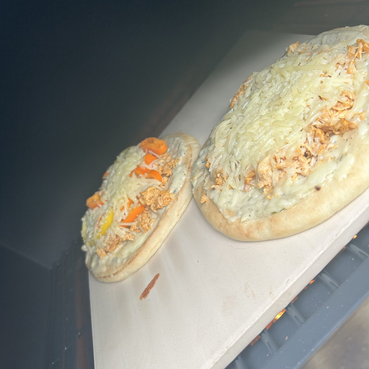 A base for grilled Buffalo chicken pizzas taking half a cup of heated sauce, a hearty teaspoon of our favorite ranch dressing mix, and a 1/4 cup of blue cheese crumbles melted in.