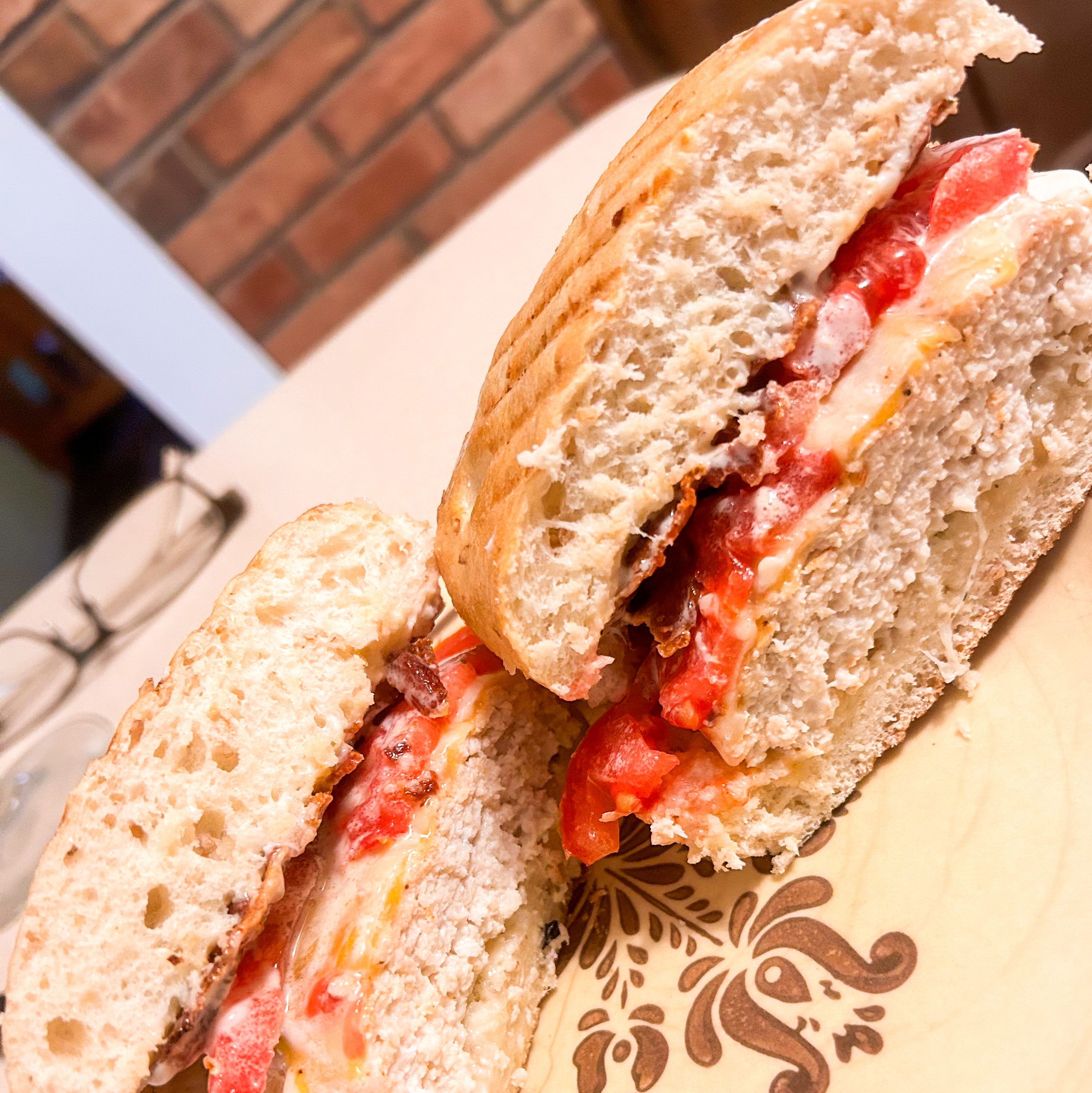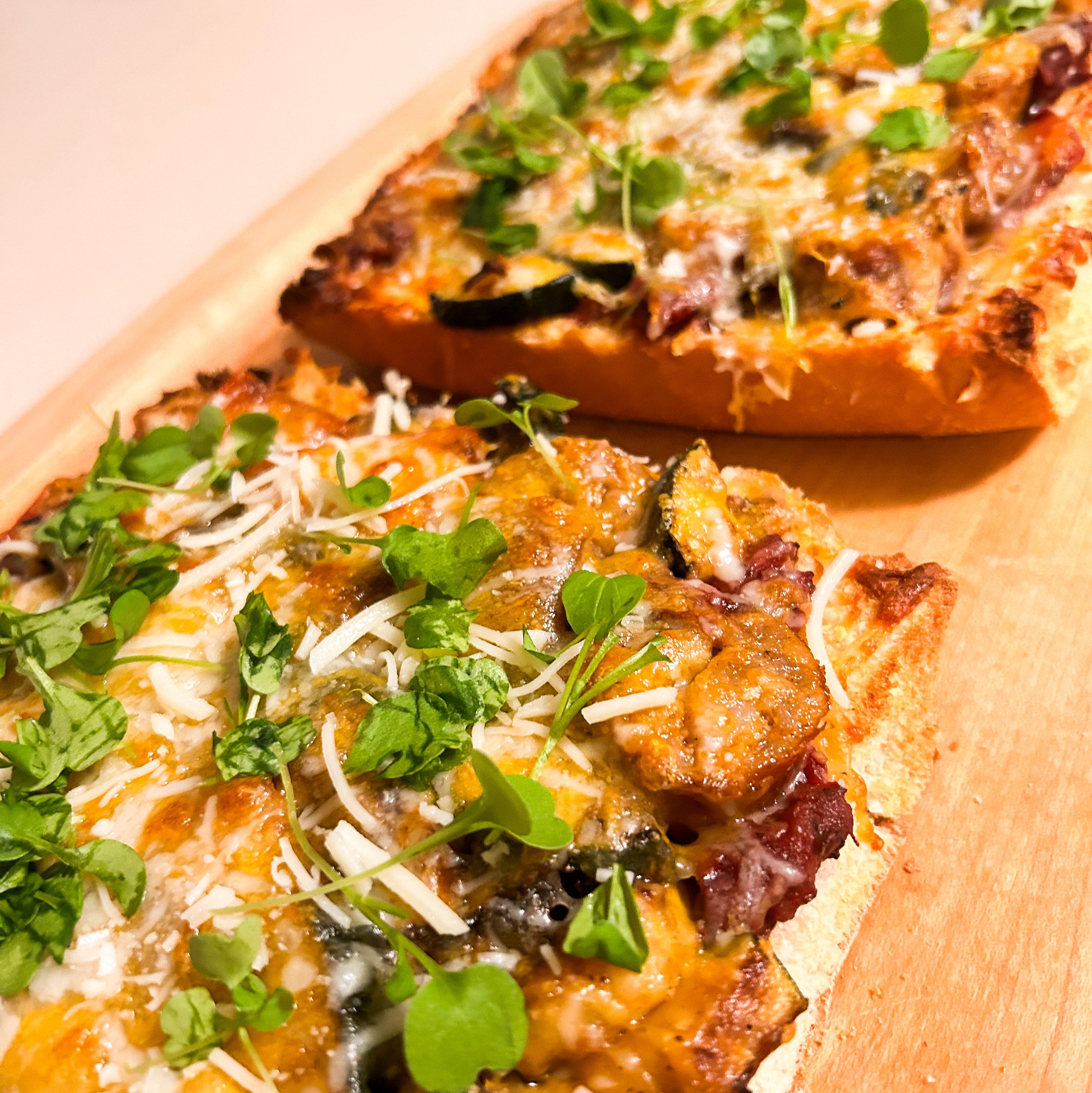 Grilled sausage, charred veggies, homemade pan sauce, and microgreens on toasted Italian bread.