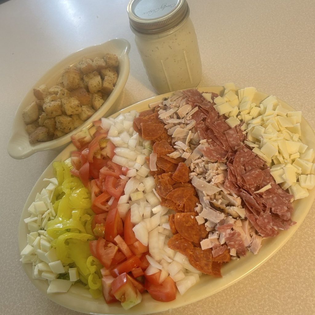 Iceberg lettuce, Roma tomatoes, pepperoncini, diced turkey, salami, provolone, and homemade croutons tossed in a tangy dressing (if you’re feeling fancy).