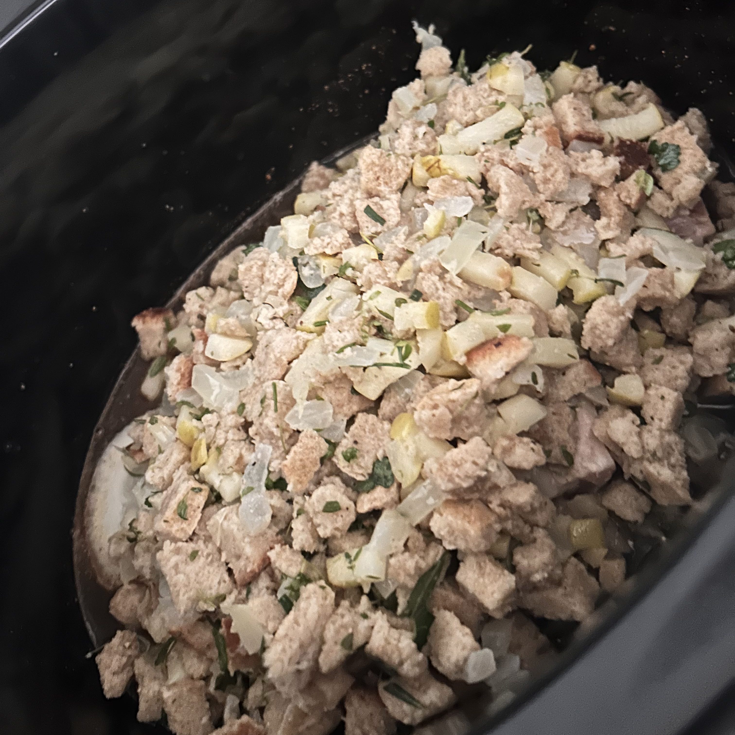 • Prepare the fresh stuffing mixture by cubing the bread remnants into bite-sized pieces and tossing with the butter and the spices. Stir in the sauteed onions and celery. Add broth until just moistened (you’ll want it a little on the dryer side because of the liquid at the bottom of the pot).