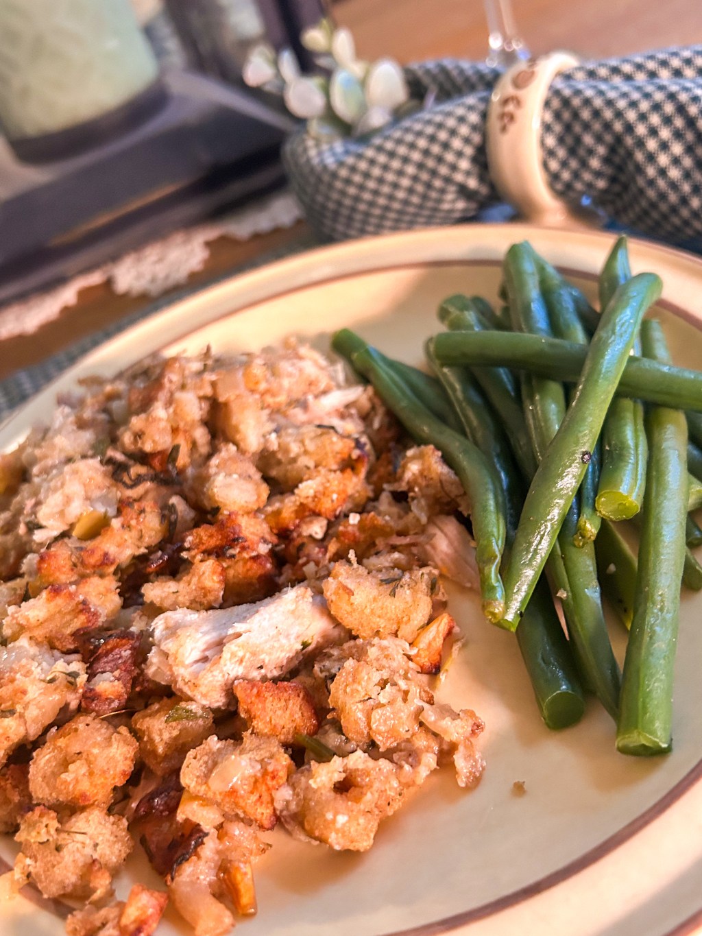 Sure, you could use a prepared stuffing mix, but I had some day-old bread begging for a second life. It turned into the most delicious, herby, golden-topped stuffing. Crusty edges, soft centers, and a depth of flavor that only homemade gives you. (seriously, try the bread recipe. You know I have some baking challenges, but this is so good)
