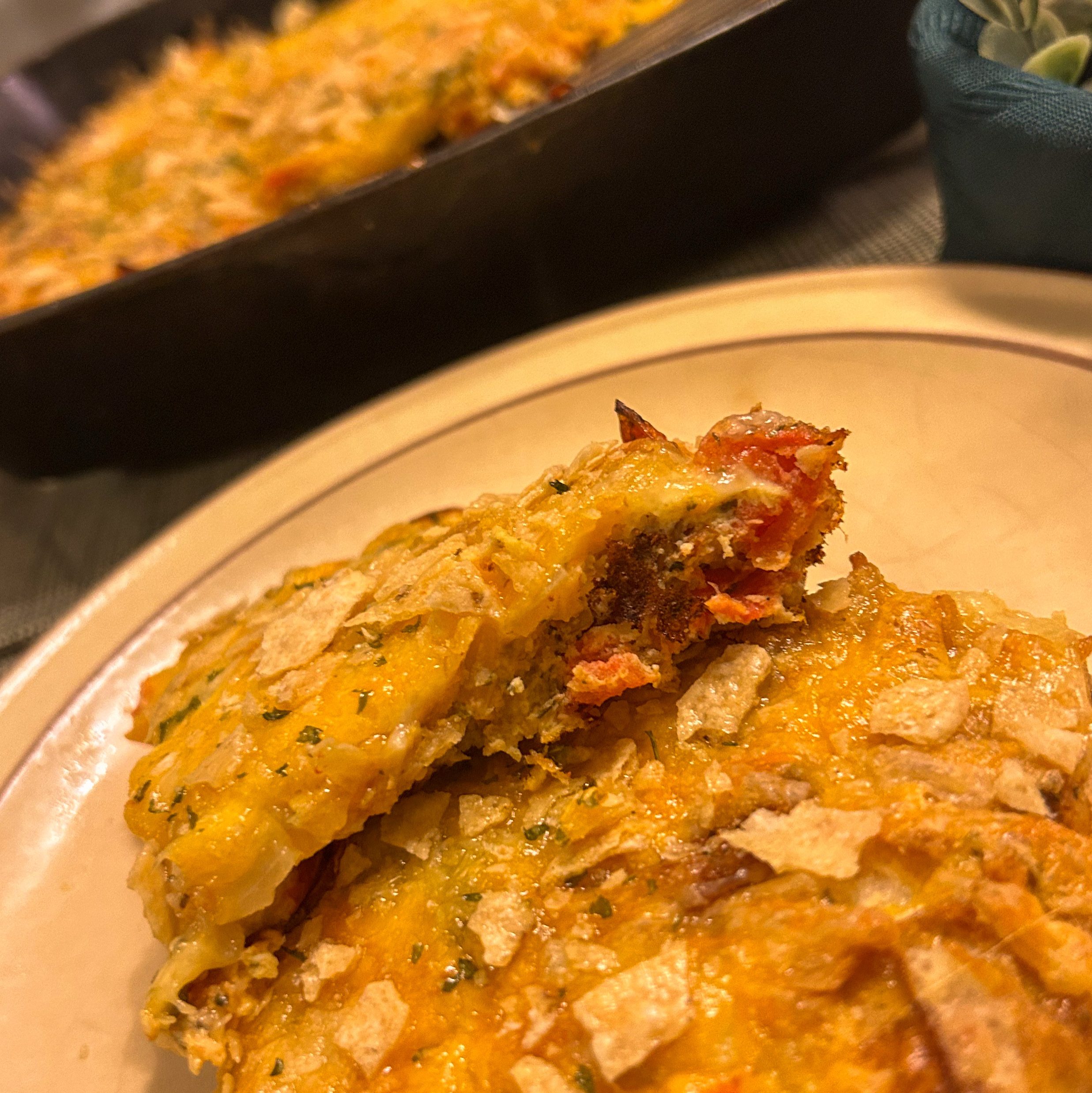 - Scatter the crushed tortilla chips over the skillet mixture.