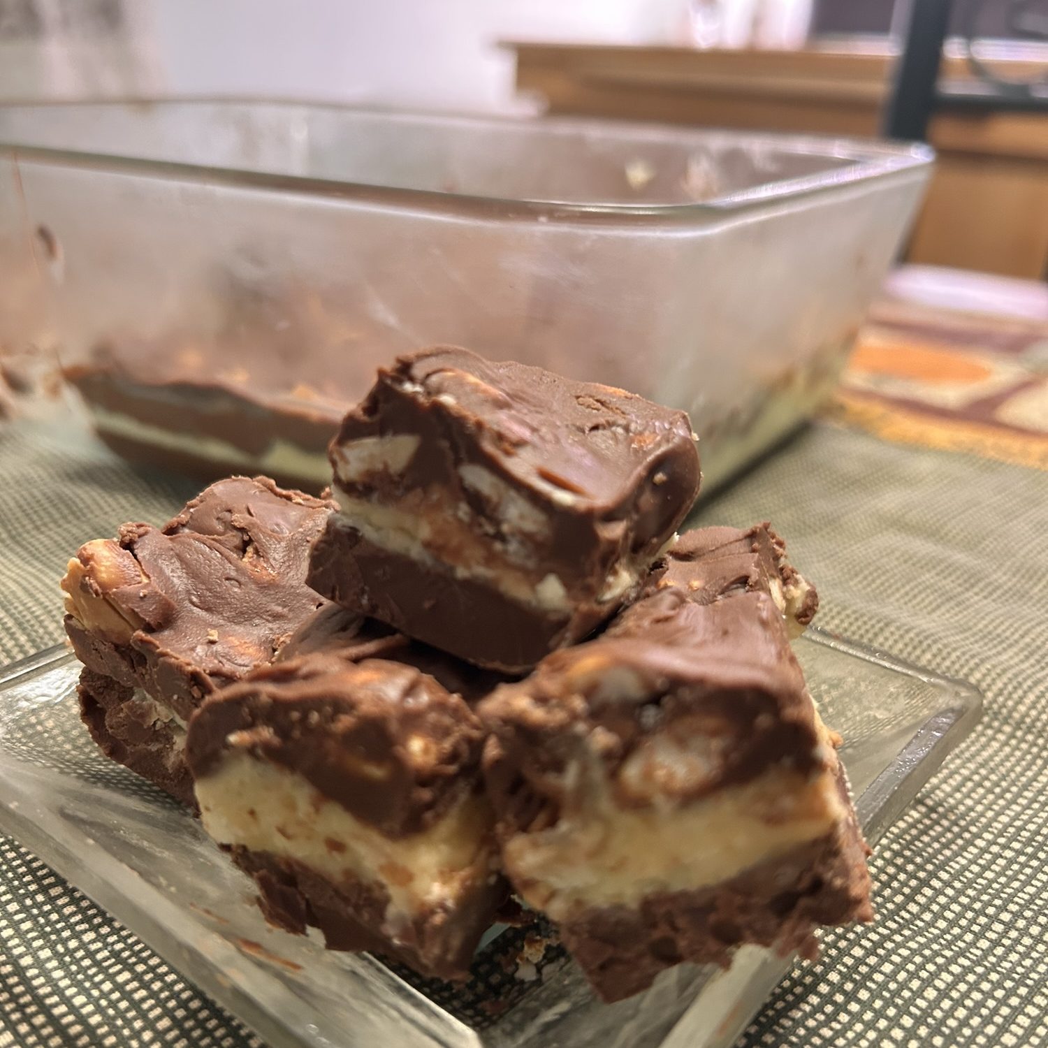 - Spread over the chocolate mixture that’s cooled in the pan.